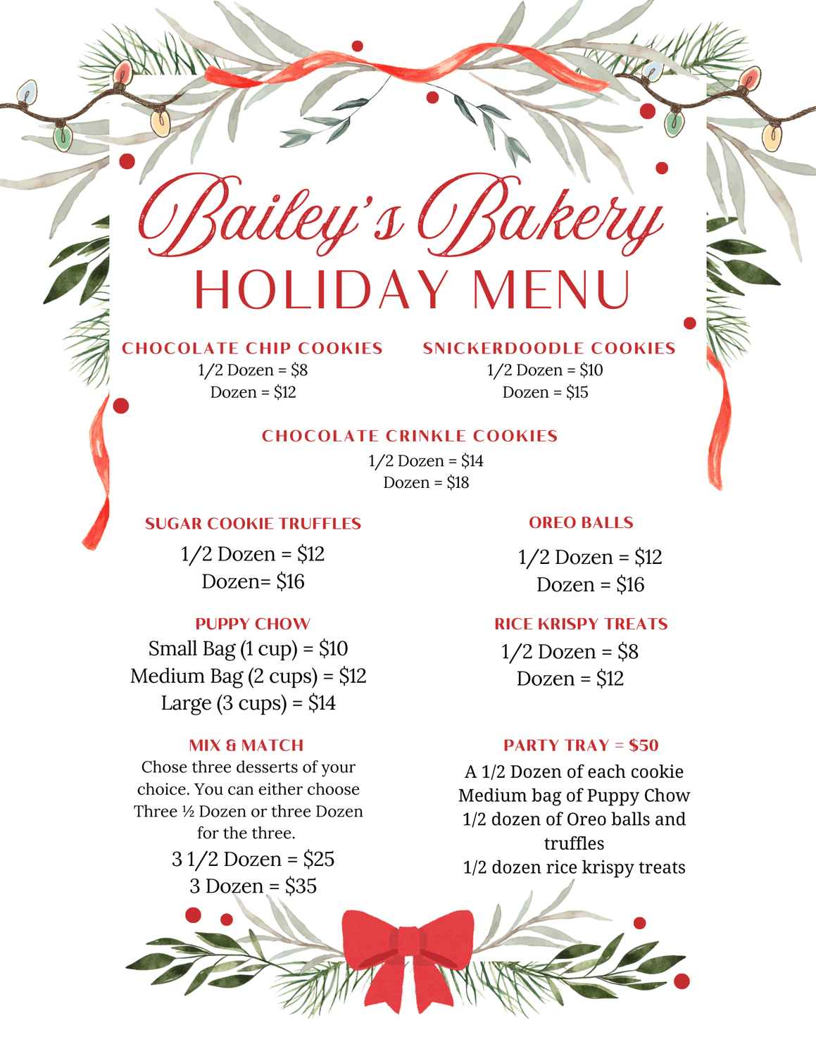 My December Menu is officially here—packed with festive holiday treats made to warm your season! From cozy classics to merry must-haves, everything is now available to order. Click the button below to see each dessert and their descriptions, and let me help make your holidays a little sweeter!