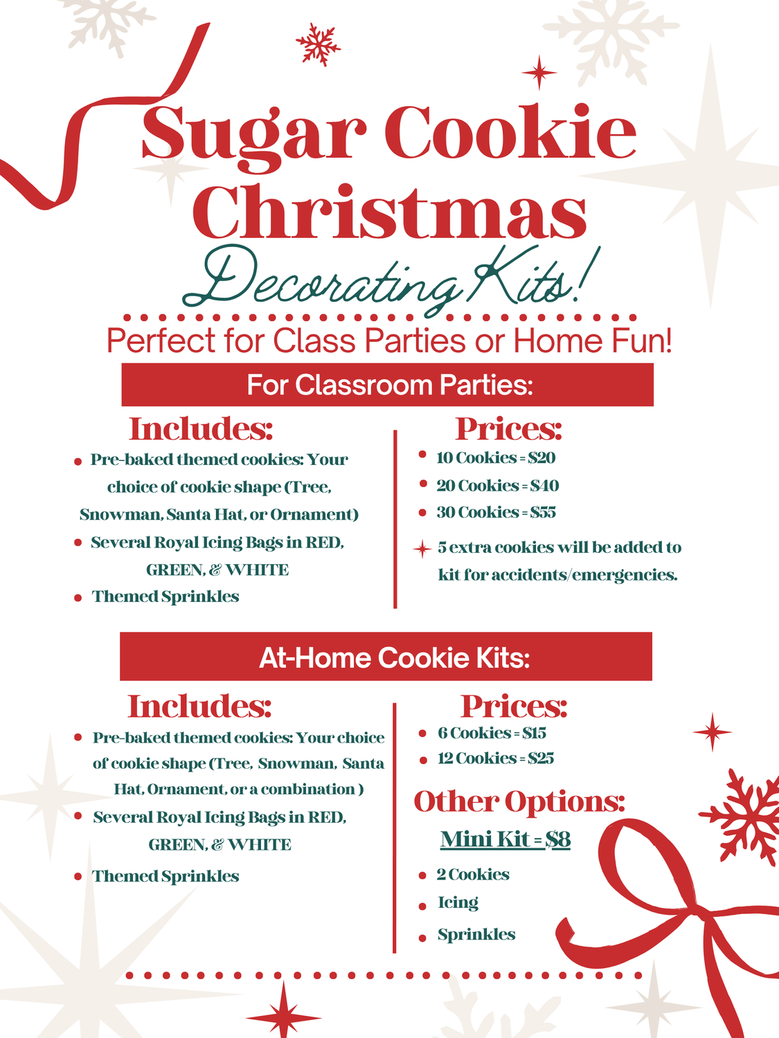 Fun, festive, and ready to decorate! Each kit comes with fresh cookies and royal icing in multiple colors, perfect for classrooms, family fun, or a sweet solo activity. Create, decorate, and enjoy a hands-on holiday treat everyone will love!