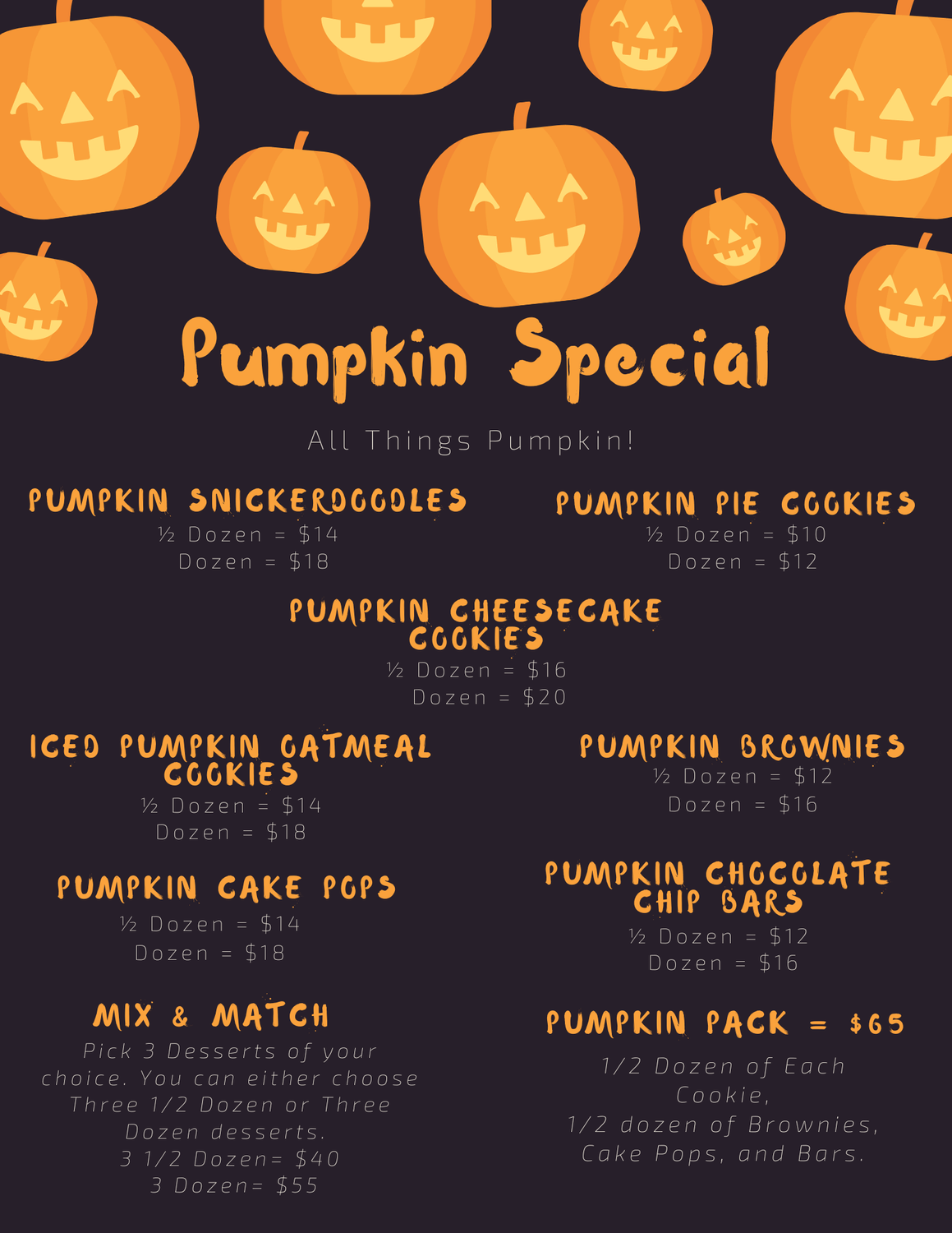 Fall has arrived, and so has my secret All Things Pumpkin dessert menu! 🎃 Indulge in seasonal favorites like pumpkin cheesecake cookies, fudgy pumpkin brownies, and pumpkin cake pops. Pumpkin lovers, this one is for you! 🍂