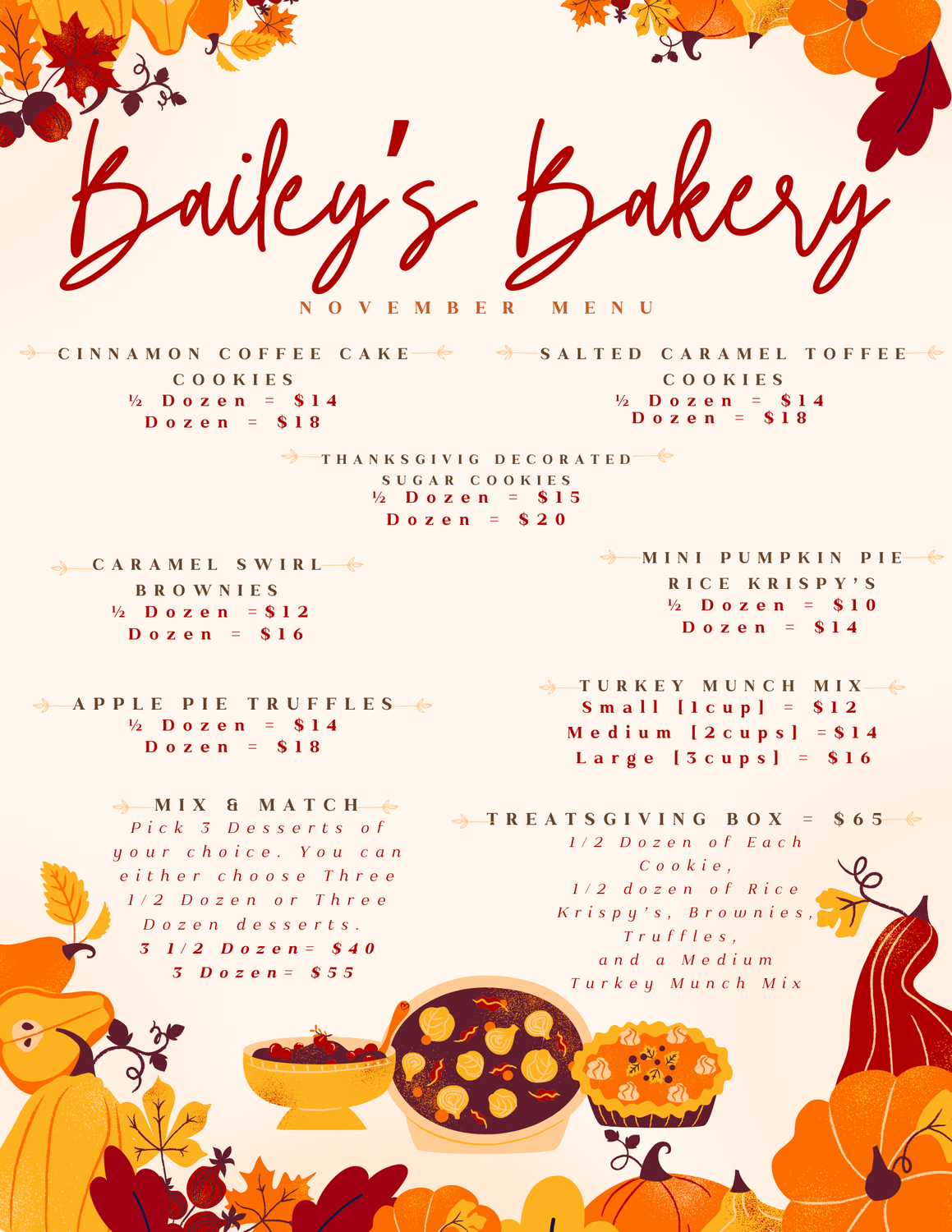 The November menu is here, and it’s full of Thanksgiving-inspired treats! From cozy pumpkin flavors to rich, indulgent desserts perfect for sharing, these seasonal goodies are made to make your gatherings extra sweet—and a little more festive too.
