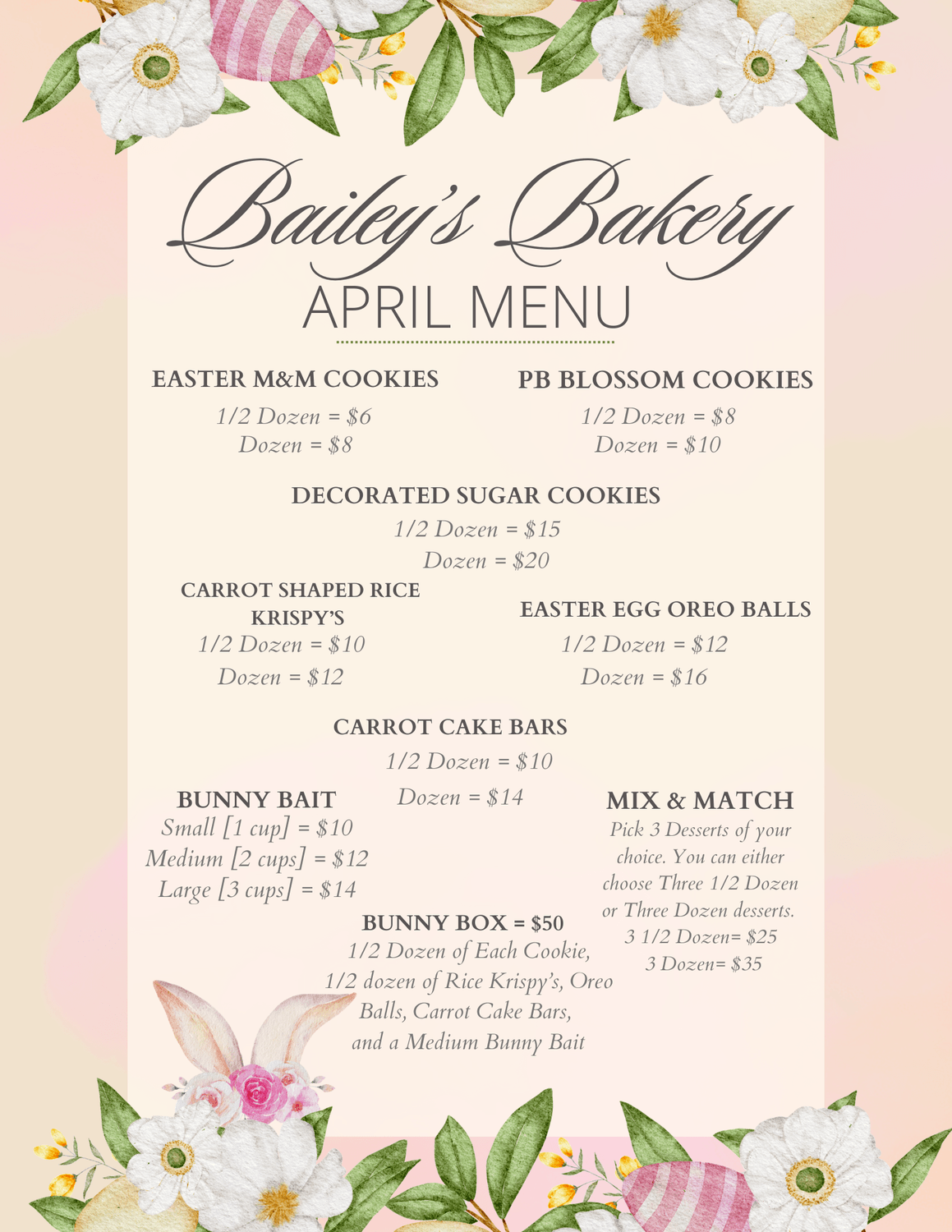 My April menu is officially here and it’s filled with all things Easter! From festive, pastel-inspired treats to sweet springtime favorites, everything is made fresh and perfect for celebrating the season. Whether you’re planning for Easter gatherings or just want something fun and delicious, there’s a little something for everyone to enjoy. 🐰🌸🧁 Click the button below to see a full description of each dessert on the menu and get your orders in before they’re gone! 🐣✝️