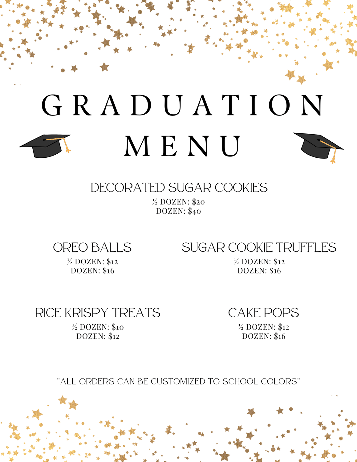 Celebrate your grad in sweet style with my special Graduation Menu! 🎓 This little menu is filled with a handful of festive treats perfect for honoring your graduate—think decorated sugar cookies, and bite-sized goodies. Whether for a party, gift, or sweet treat just for them, these desserts add the perfect touch to graduation celebrations! Click the button below to see a full description of each dessert on the menu.