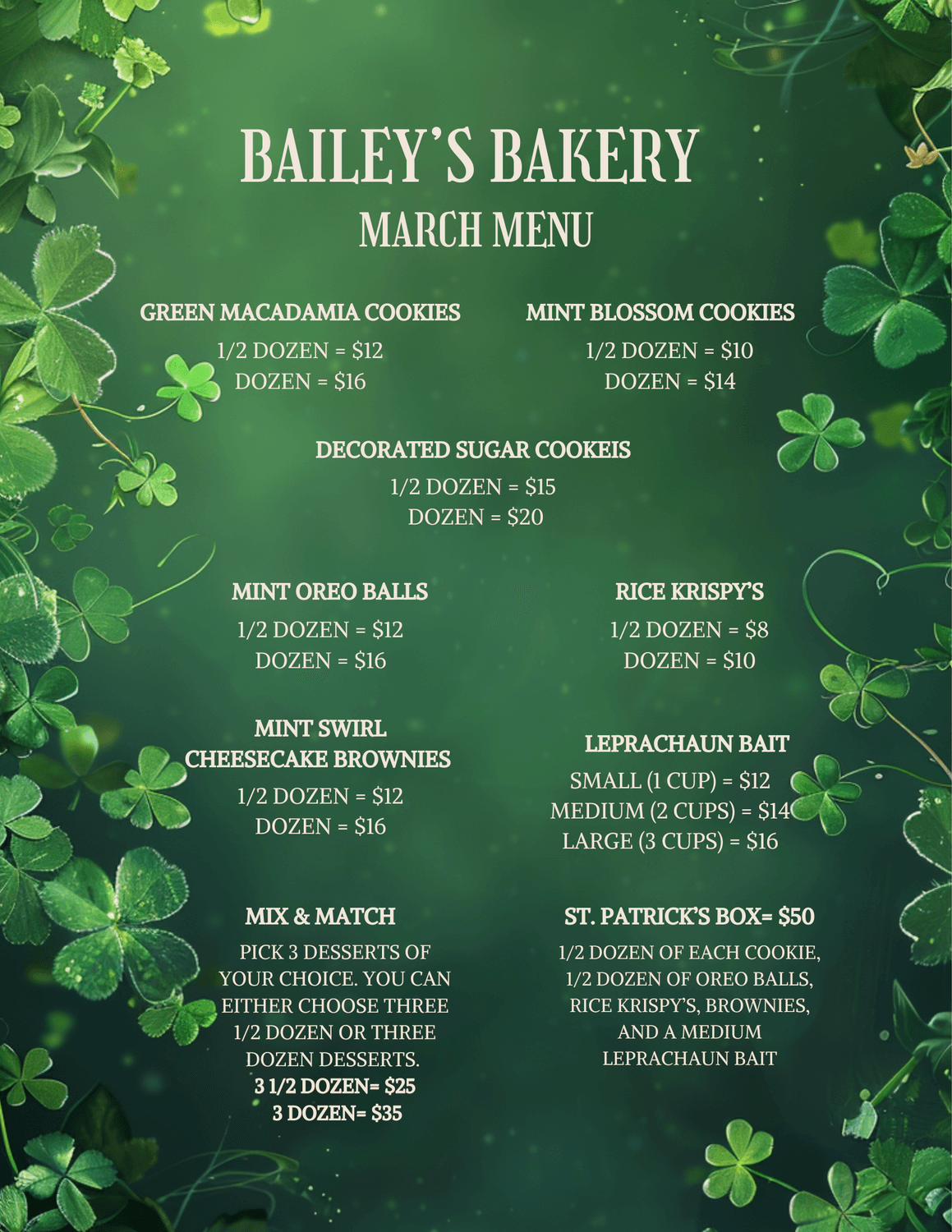 My March dessert menu is officially here and it’s full of St. Patrick’s Day inspired treats! 🍀 From festive flavors to fun, themed goodies, everything is made from scratch and perfect for celebrating the season. Click the button below to see a full description of each dessert on the menu and get your orders in before they’re gone! 💚✨