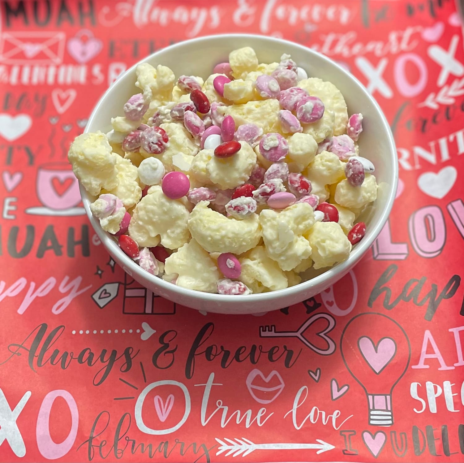 Light, crunchy puff popcorn coated in creamy white chocolate and sprinkled with festive Valentine’s M&M’s for the perfect sweet-and-crunchy treat. 💕🍿🍫